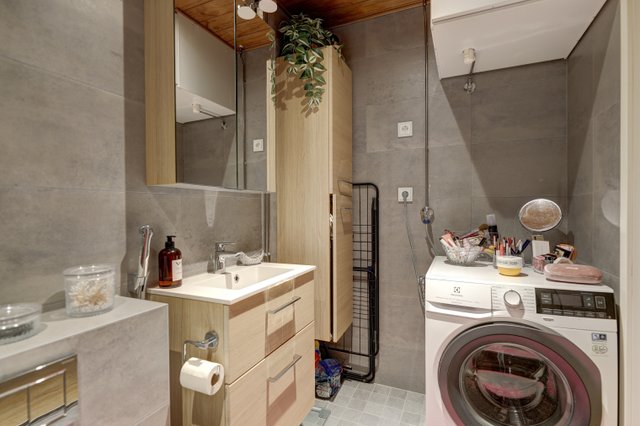 - WC-istuin, suihku, pesukoneliitäntä, bidee-suihku, lattialämmitys, pesuallas, peilikaappi, ja suihkuseinä