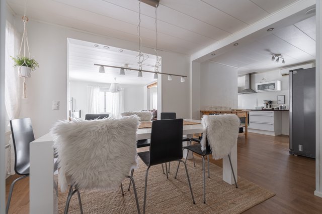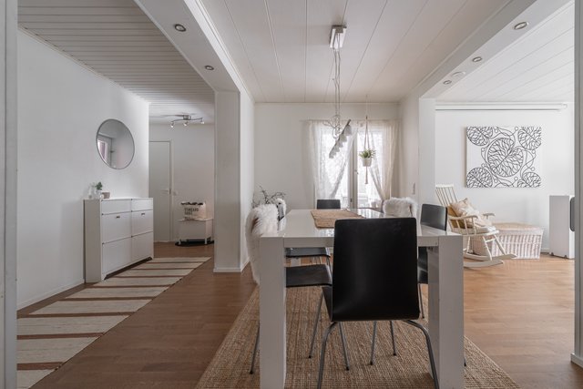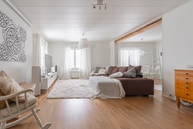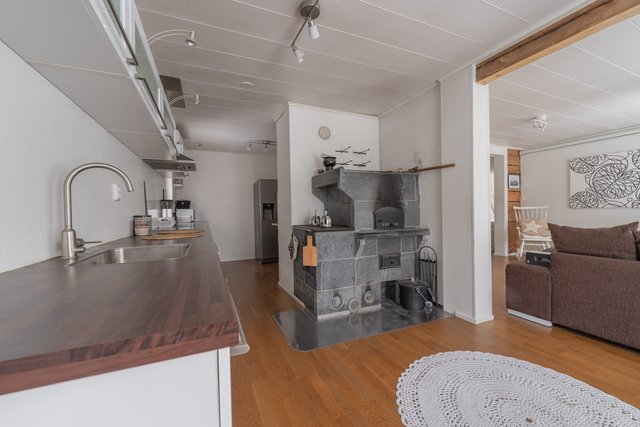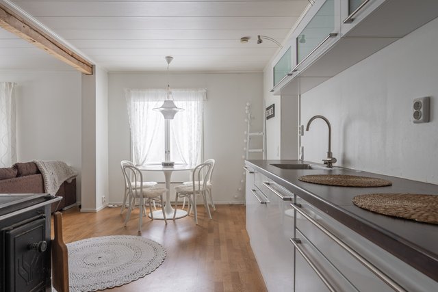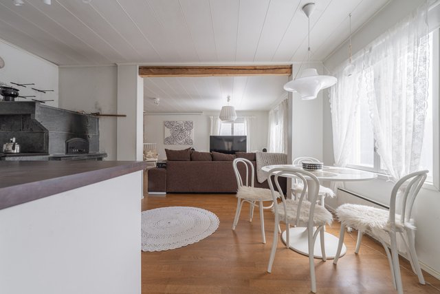 Kodin sydän on avara olohuone, joka yhdistyy ruokailutilaan, luoden täydelliset puitteet perheen yhteisille hetkille. Keittiö on uusittu vuonna 2012 ja varustettu laadukkailla Korona-keittiön kalusteilla. Keittiön leivinuuni ja puuhella tuovat lämpöä ja tunnelmaa kylmiin talvi-iltoihin.