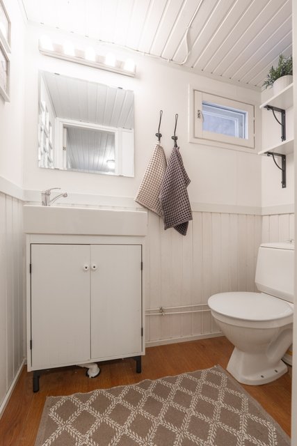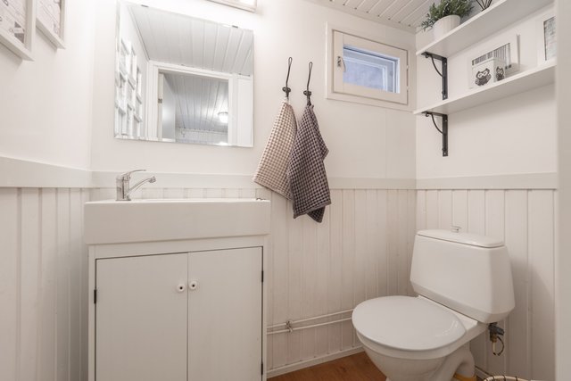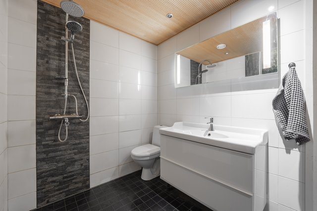 - Suihkuseinä, pesukone, peilikaappi, pesuallas, pesukoneliitäntä, suihku, ja wc-istuin