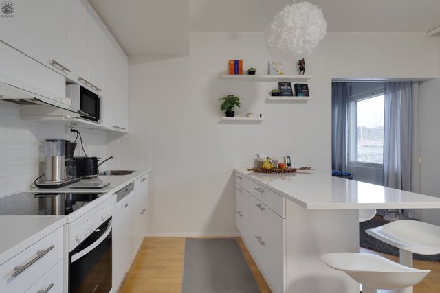 Asunnon keittiö on remontoitu nykyajan trendejä noudattaen, ja kaikki ratkaisut on mietitty tarkkaan jotta, kokkaaminen olisi vaivatonta. Keittiön yhteydessä saareke, jonka ympärillä mahdut syömään, ja jossa runsaasti kaappitilaa.. Olohuoneesta pystyt helposti suunnittelemaan oman viihtyisän rentoutumispaikan.
