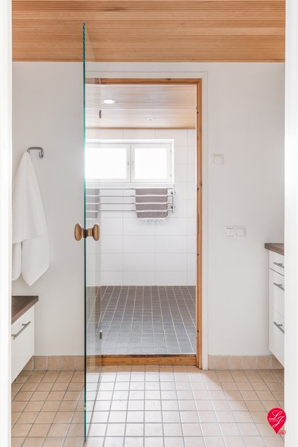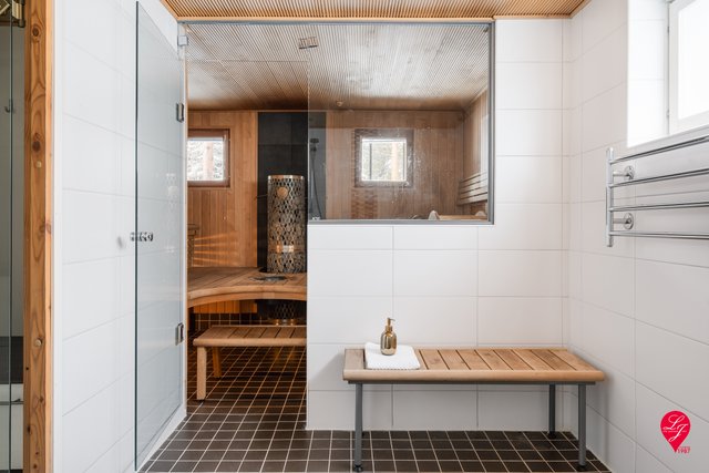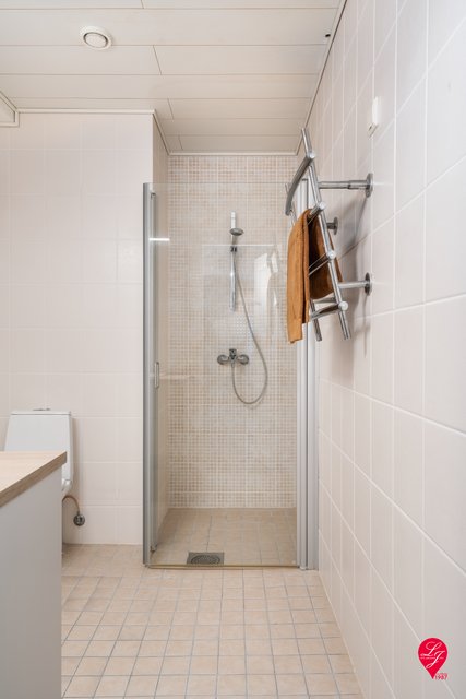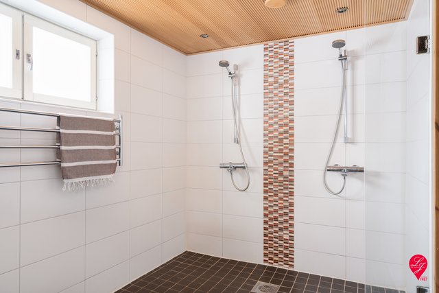 - Varusteet: Yläkerran kph:ssa suihku, suihkuseinä, wc-istuin, peilikaappi, pesuallas, allaskaappi, pyyhekuivain (sähkökäyttöinen). Saunan ph:ssa 2 suihkua, pyyhekuivain (sähkökäyttöinen). Seinämateriaalit: Kaakeli Lattiamateriaalit: Laatta