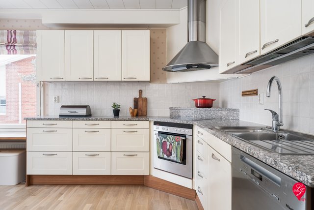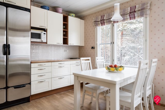 - Varusteet: Jää- ja pakastinkaapit, astianpesukone, liesituuletin, erillisuuni, keraaminen liesi, työtasojen materiaalit kiveä ja puuta. Seinämateriaalit: Laatta ja tapetti Lattiamateriaalit: Parketti