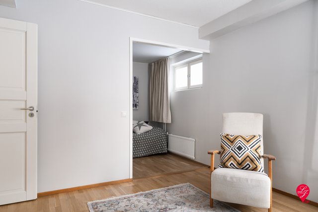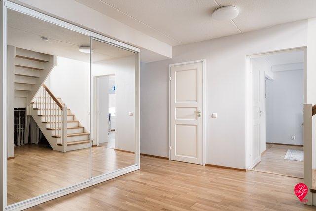 Huoneistossa on juuri tehty pintaremontti: kaunis parketti hiottiin, wc-tilojen kaapistot sekä alakerran valaistus uusittiin ja seinät maalattiin, ja eteinen sai uuden tilavan liukuovikaapiston.