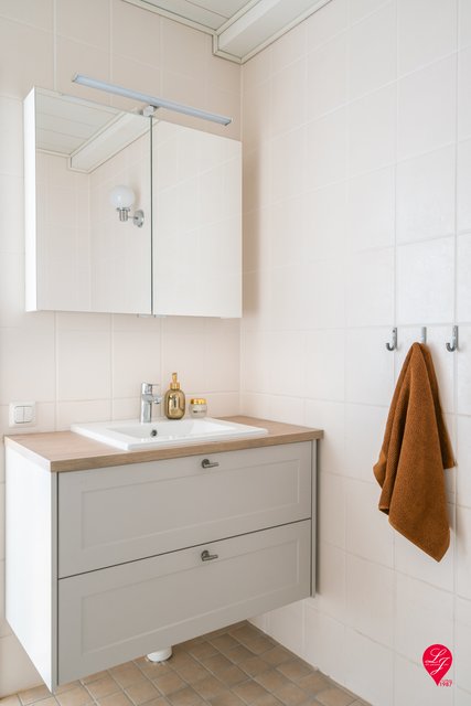 - Varusteet: Wc-istuin, allaskaappi, pesuallas, peilikaappi ja lattiakaivo Seinämateriaalit: Kaakeli Lattiamateriaalit: Laatta