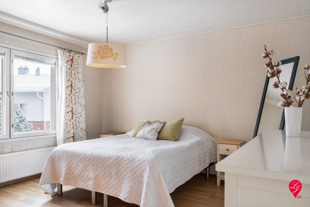 - Varustus: makuuhuoneissa on tilavat vaatehuoneet, joista yksi muutettu alkoviksi. Seinämateriaalit: Maali, tapetti Lattiamateriaalit: Parketti