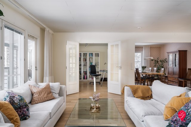 Talon huoneet ovat tilavia ja tarjoavat monipuoliset tilat koko perheelle. Yläkerran työhuone ja ruokasali muuntuvat tarvittaessa makuuhuoneiksi. Jokaisessa makuuhuoneessa on oma vaatehuone, joista yksi on muutettu ikkunalliseksi makuualkoviksi.