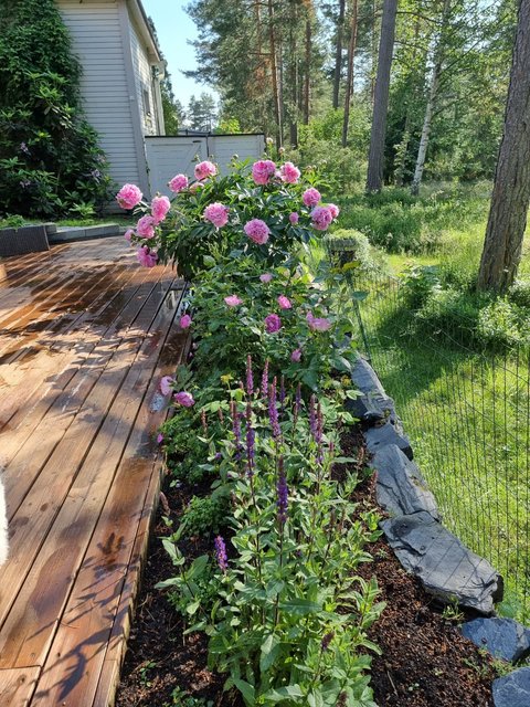 kaiteiden laudoitus ja parvekkeiden vaakateräspalkit maalattiin.