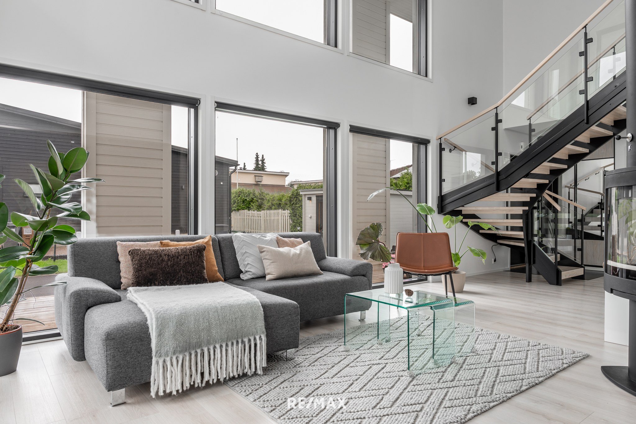 - Näyttävä, valoisa avara olohuone, isoilla ikkunoilla ja korkealla huonekorkeudella. Yläkerrassa toiminnallinen arkiolohuone, toimii erinomaisesti vaikka lasten leikkitilana, pelihuoneena, kirjastohuoneena tai tv-huoneena.