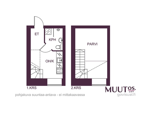 - Pohjapiirroksen mukainen asuintilojen pinta-ala 16 m² ja muut tilat 10 m², johon on laskettu makuuparvi (normaalia matalampi tila, n. 165 cm). Yhtiön huoneistojen pinta-aloja ei ole tarkistusmitattu. Mitattaessa ne saattavat olla ilmoitettua suurempia tai pienempiä. Hinta ei ole pinta-ala perusteinen. Yhtiöjärjestyksen mukainen huoneistoselitelmä: 2h+kt.