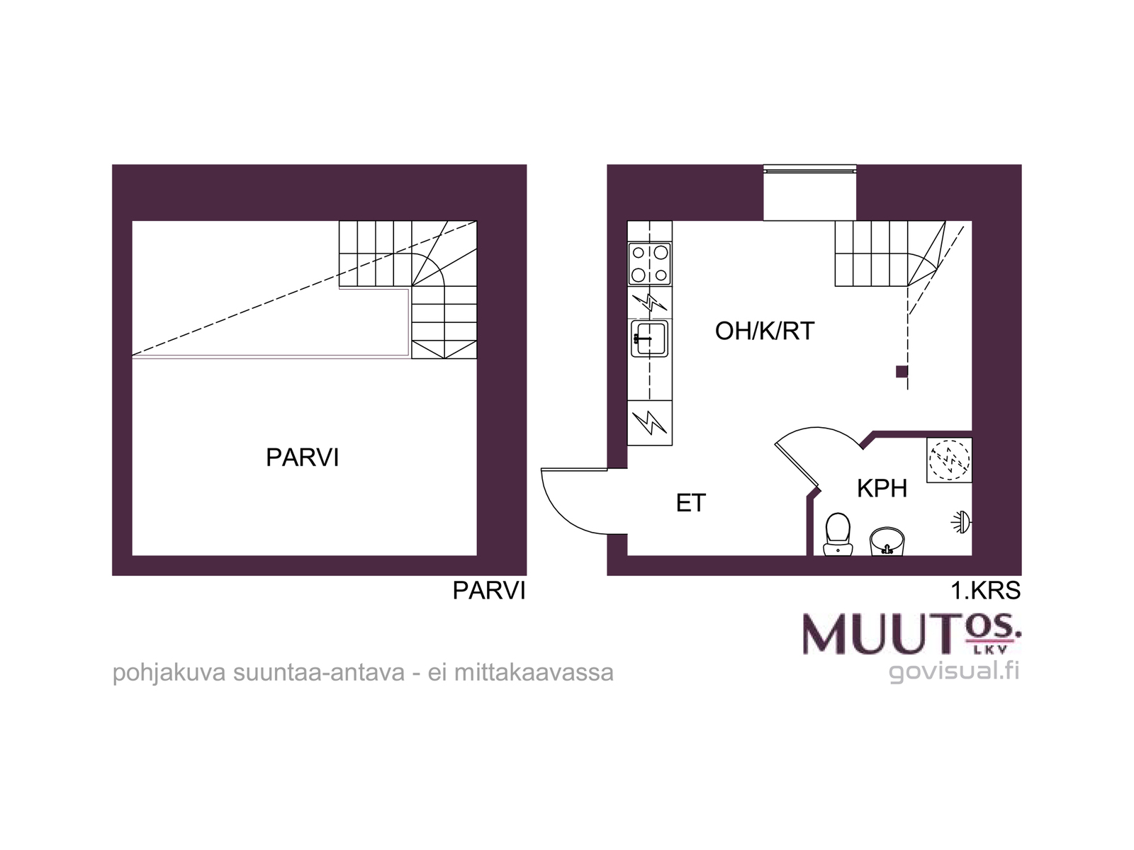 - Pohjapiirroksen mukainen asuintilojen pinta-ala 20 m² ja muut tilat 10 m², johon on laskettu makuuparvi (normaalia matalampi tila). Yhtiön huoneistojen pinta-aloja ei ole tarkistusmitattu. Mitattaessa ne saattavat olla ilmoitettua suurempia tai pienempiä. Hinta ei ole pinta-ala perusteinen. Yhtiöjärjestyksen mukainen huoneistoselitelmä: 2h+kt.