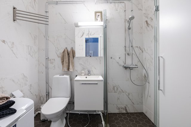 - WC-istuin, suihku, suihkuseinä, pesukoneliitäntä, lattialämmitys, peilikaappi, pesuallas, allaskaappi, ja bidee-suihku