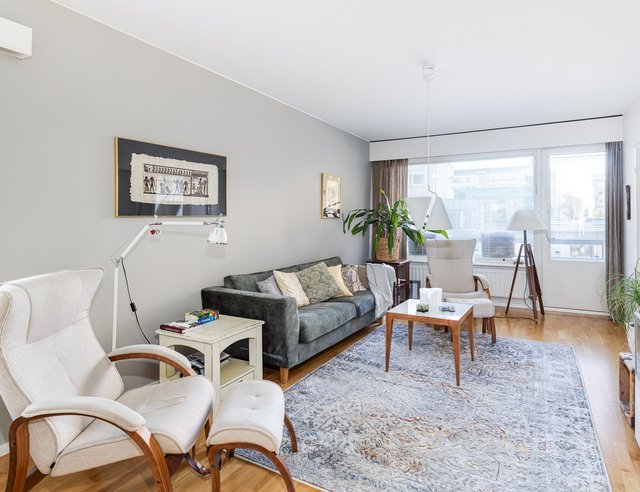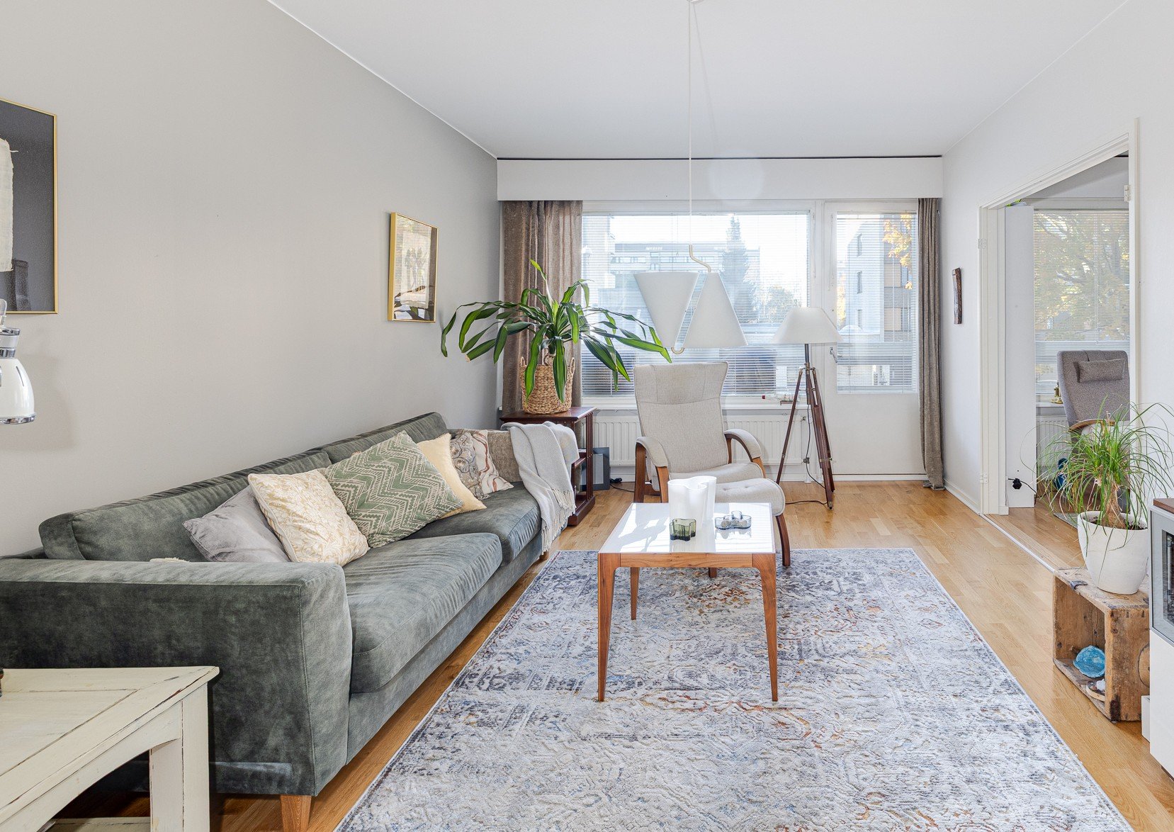 Tämä läpitalon päätyhuoneisto on ihanteellinen yhdistelmä tyyliä ja toimivuutta. Asunnon vaaleat sävyt ja kolmeen suuntaa olevat ikkunat luovat ilmavuutta ja avaruutta, ja huoneet jakautuvat käytännöllisesti. Kolme erillistä makuuhuonetta sijoittuvat eripuolille huoneistoa, luoden oman rauhan jokaiselle makuuhuoneelle. Tilava olohuone sijoittuu asunnon päähän ja kahteen suuntaan avautuvat ikkunat tuovat tilaan valoa ja ilmeikkyyttä. Keittiö on heti sisään tultaessa vasemmalla.