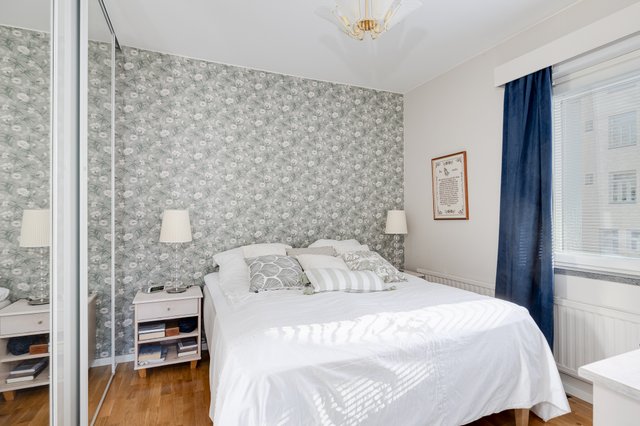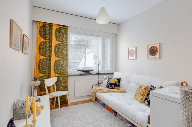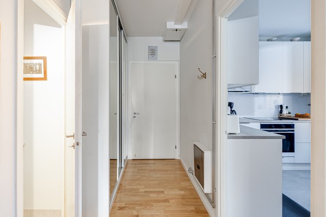 Denna gavellägenhet som sträcker sig genom huset är en idealisk kombination av stil och funktionalitet. De ljusa tonerna och fönstren i tre väderstreck ger en känsla av rymd och ljus, och rummens fördelning är praktisk. De tre separata sovrummen är placerade på olika sidor av lägenheten, vilket ger lugn och avskildhet åt varje rum. Det rymliga vardagsrummet ligger i ena änden av bostaden, och fönster i två riktningar ger rummet både ljus och karaktär. Köket ligger till vänster direkt vid entrén.