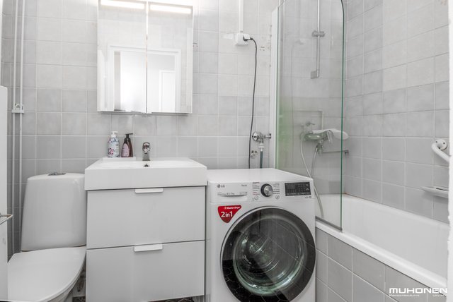 - Suihku, wc-istuin, pesukoneliitäntä, peilikaappi, pesuallas, kylpyamme, ja allaskaappi