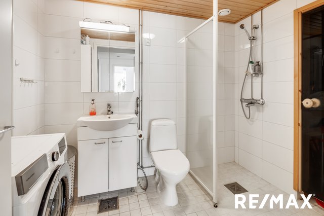 - WC-istuin, suihku, suihkuseinä, pesukoneliitäntä, peilikaappi, pesuallas, allaskaappi, ja bidee-suihku