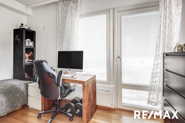Tämä toisen kerroksen valoisa ja kompakti kolmio tarjoaa varsin loistavaa kokonaisuutta seuraavalle ostajalleen. Asunnon pohjaratkaisu taipuu moneen eri talouteen, tähän asuntoon kuuluu mm. avonainen keittiö pienellä syvennyksellä, vaatehuone, oma sauna sekä lasitettu parveke pienemmän makuuhuoneen yhteydessä. Tästä toisesta makuuhuoneesta saa myös näppärästi työhuoneen käyttöön tarpeen mukaan. Päämakuuhuoneeseen mahtuu iso parisänky ja tämän yhteydestä löytyy mainittu erillinen vaatehuone. Eteiseen on myös laitettu säilytyskaapistoa. Sen lisäksi yhtiö tarjoaa varastointitilaa jokaiselle käyttöön tarkoitetulla henkilökohtaisella varastolla. Tämä huoneisto on velaton.
