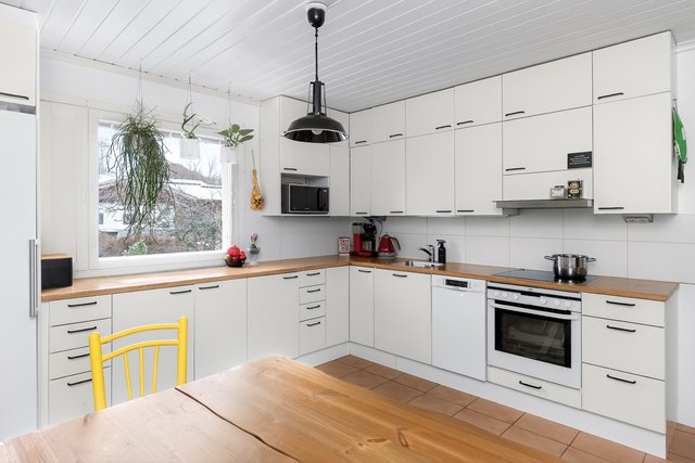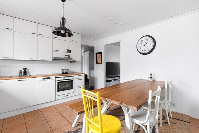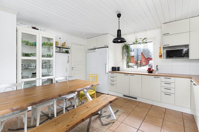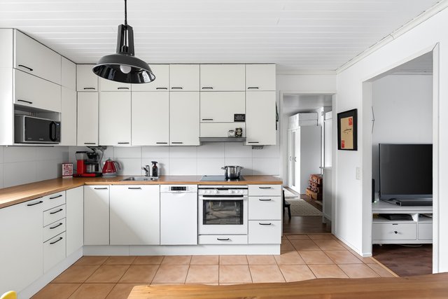 Keittiö on tilava ja josta löytyy hyvin tasotilaa. Myös käytännöllinen kodinhoitohuone löytyy.