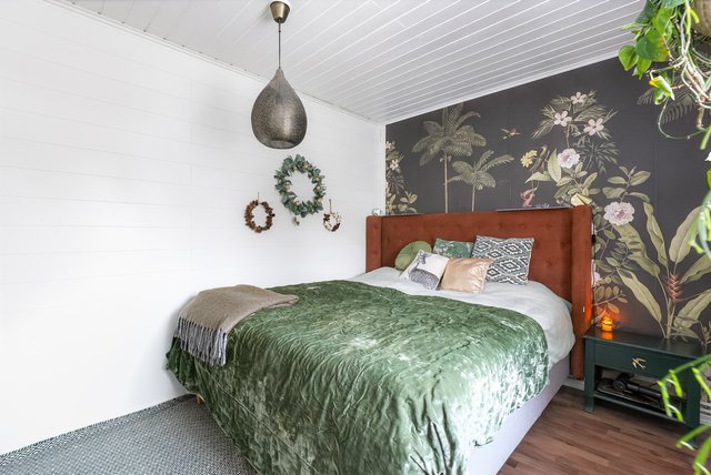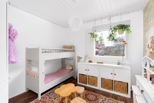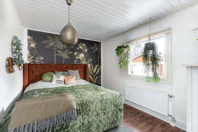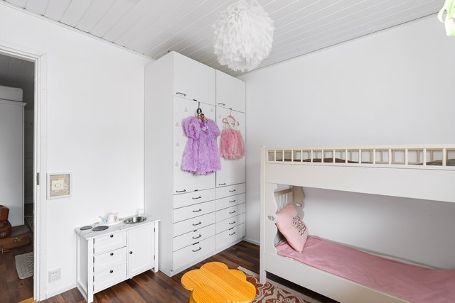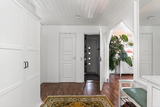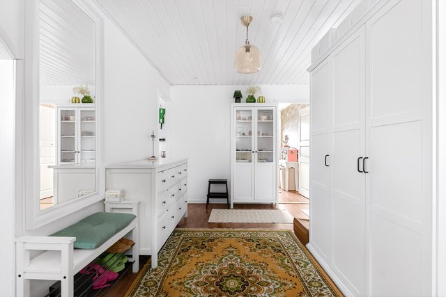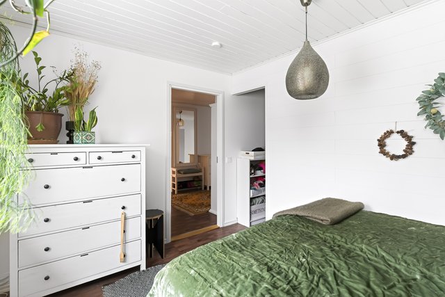 Heti sisääntulossa on tilava eteisaula. Päämakuuhuoneella on iso vaatehuone, eri puolella taloa on kaksi makuuhuonetta ja tarvittaessa takkahuoneesta saa ihanan makuuhuoneen. Siitä on käynti niin saunaosastoon kuin katetulle suojaiselle terassillekin.