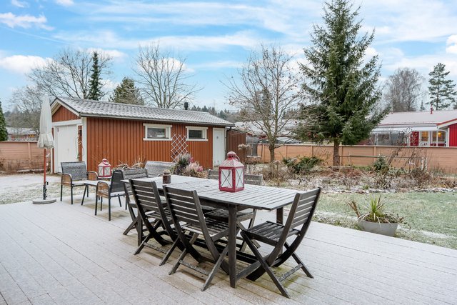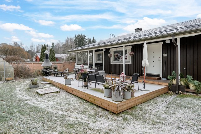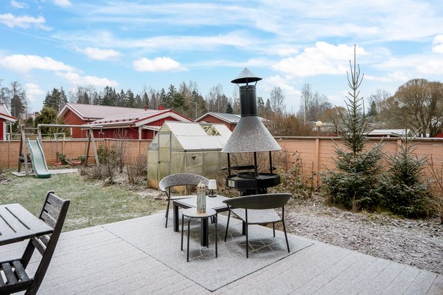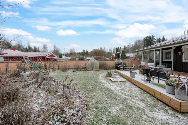 Kaunis aidattu piha, jossa on 35m2 upea terassialue, paljon istutuksia ja kasvihuone.