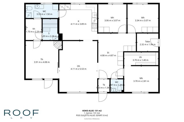 - Keravan kaupungin rakennusvalvonnan epävirallisen rakennus- ja huoneistorekisteriotteen mukaan talon huoneistoala on 125 ja kerrosala 144 m2 sekä autotallin kerrosala 28 m2. Edellä mainitut pinta-alat saattaa tämän ikäisessä kohteessa poiketa olennaisestikin asuinrakennusten nykyisten mittaustapojen ja standardien mukaan laskettavasta asuintilojen pinta-alasta. Asuinrakennuksen todellinen asuinpinta-ala voi täten myyntiesitteestä ja ilmoitetusta tiedosta poiketa olennaisesti. Hinta ei määräydy pinta-alan perusteella, vaan perustuu kiinteistöön kokonaisuutena. Todellisen asuinpinta-alan selvittämiseksi suositellaan tarkistusmittausta.