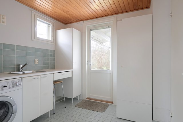 - Pesukoneliitäntä, lattialämmitys, pesuallas, lattiakaivo, pyykkikaapit, ja pöytätaso
