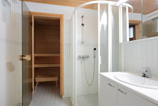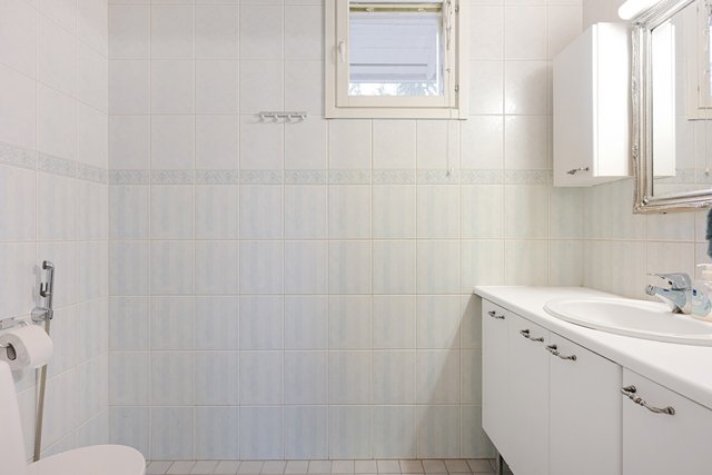 - Suihku, suihkuseinä, lattialämmitys, peilikaappi, pesuallas, ja allaskaappi