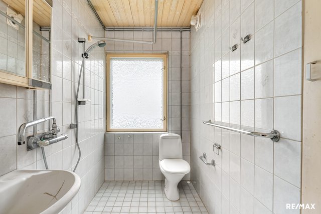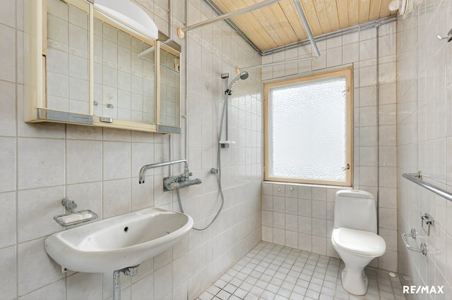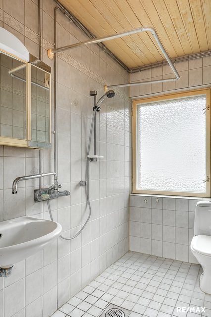- Asuinkerroksessa wc/kylpyhuone, jossa suihku, peilikaappi, allas, wc-istuin. Seinät ja lattia laatoitettu.