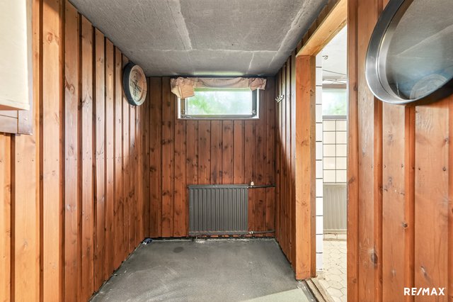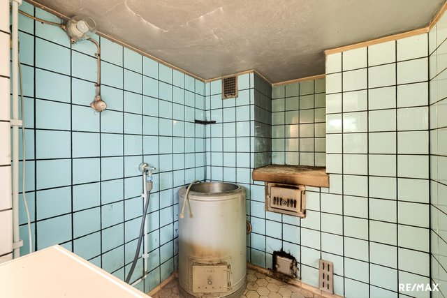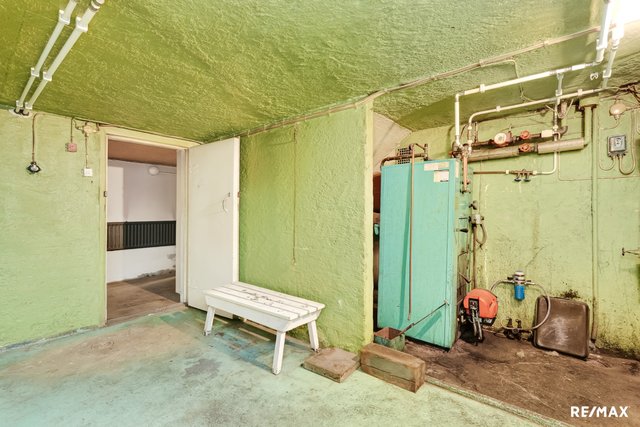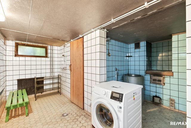 - Kellarikerroksen saunan ja kylpyhuoneen yhteydessä kodinhoitotila, jossa muuripata, pesukoneliitätäntä. Seinät ja lattia laatoitettu.