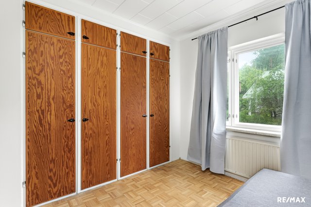 Makuuhuoneita on kaksi ja toisessa alkuperäiset vaatekaapistot. Makuuhuoneiden välissä on wc/kylpyhuone.