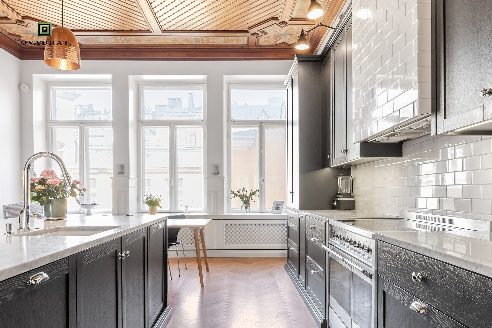 Tässä 204 neliömetrin kodissa on onnistuneesti yhdistetty historiallinen charmikkuus ja moderni mukavuus. Tilavassa ja hyvin varustellussa keittiössä on laadukkaat kodinkoneet sekä suuri saareke, joka tekee siitä jokaisen kotikokin unelman. Keittiö ja olohuone yhdistyvät luontevasti, tarjoten täydellisen tilan niin arjen kuin juhlienkin viettoon.