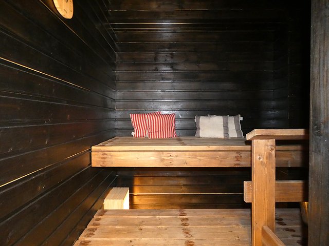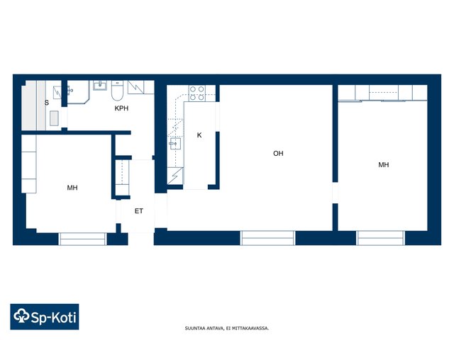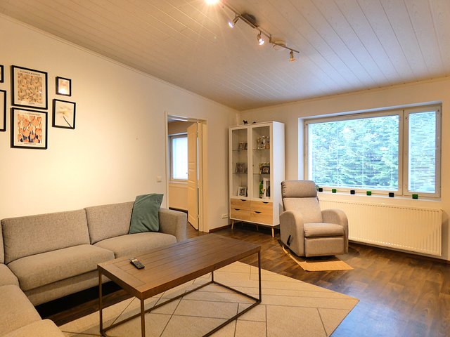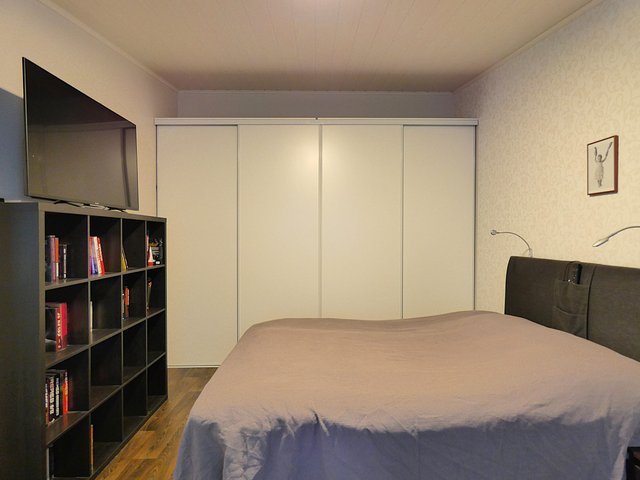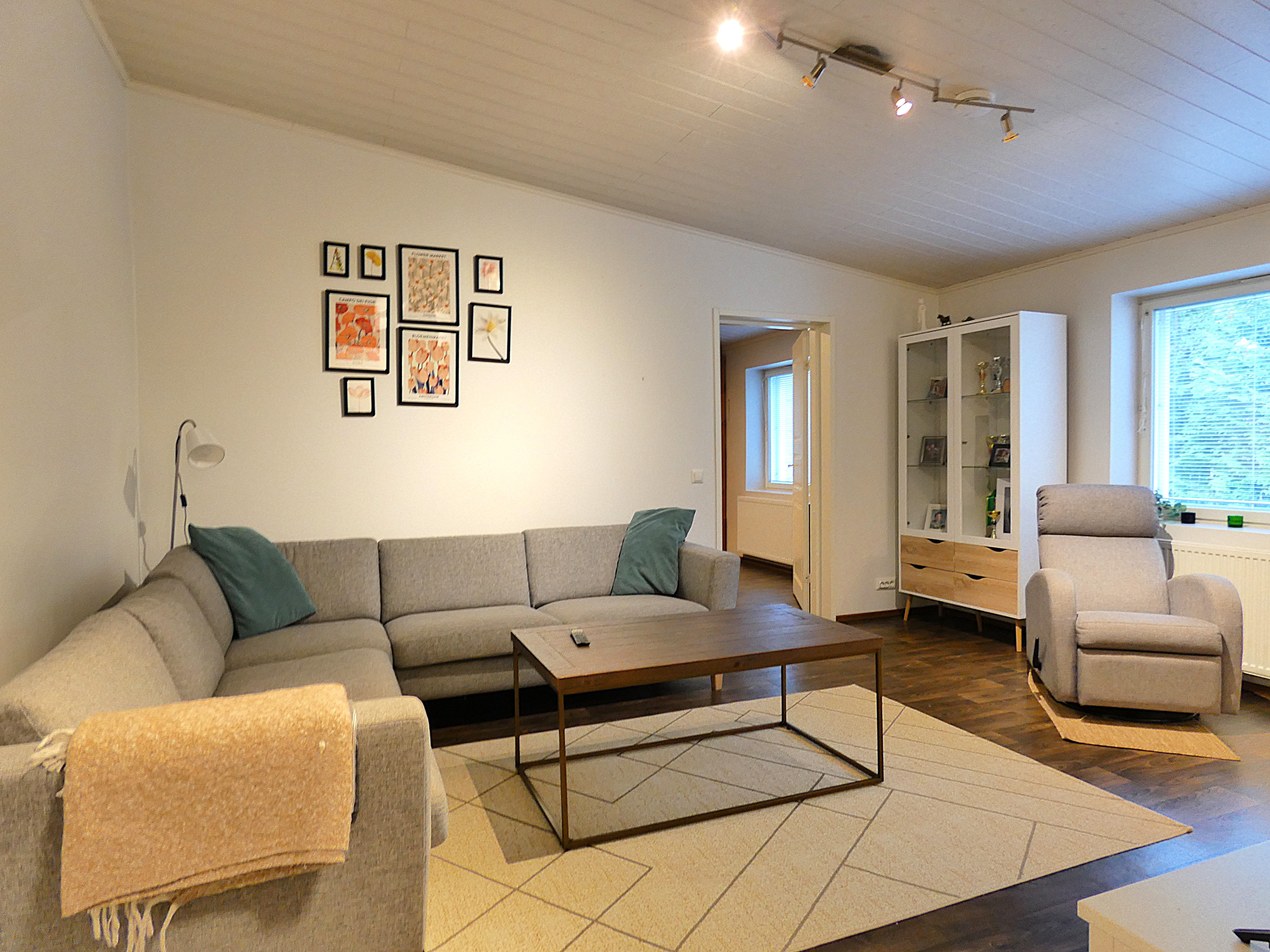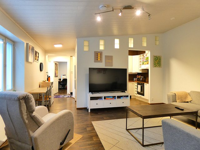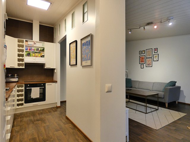 Asunnon pohjaratkaisu poikkeaa mukavasti tavanomaisesta. Makuuhuoneet ovat asunnon eri päädyissä ja kummassakin on hyvin kaappitilaa säilytykseen. Olohuone ja keittiö ovat asunnon keskellä. Vinokatto antaa tiloille ilmavuutta. Keittiössä on valkoiset sileäpintaiset kaapistot, varustuksena mm. induktioliesi ja erillisuuni. Kylpyhuone on tilava ja seinissä on näyttävä iso tumma laatta. Sauna on samaan sävyyn tummansävyinen.