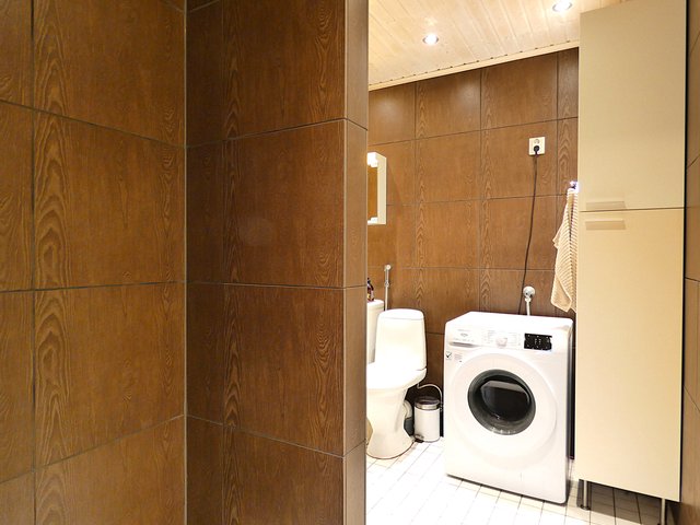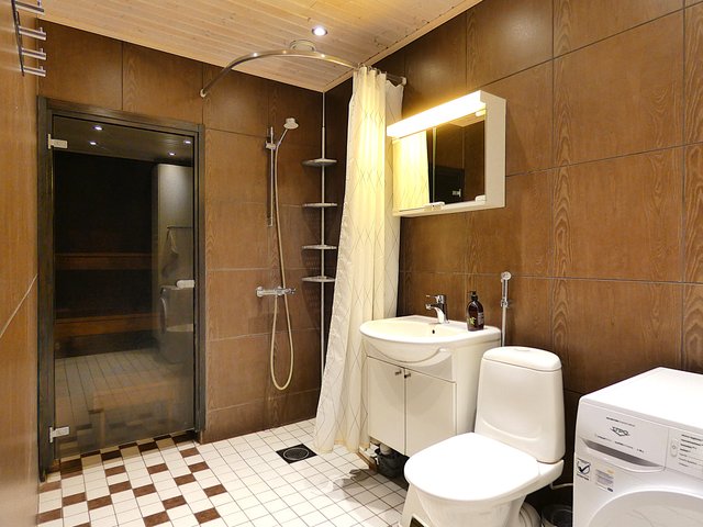 - WC-istuin, suihku, pesukoneliitäntä, lattialämmitys, ja peilikaappi