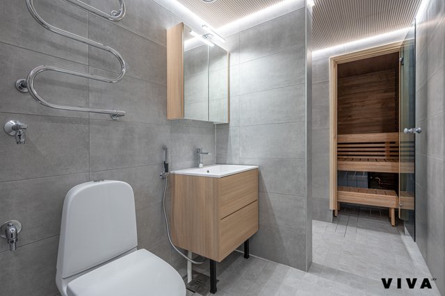 - Suihku, pesukoneliitäntä, peilikaappi, pesuallas, wc-istuin, allaskaappi, bidee-suihku, ja lattialämmitys