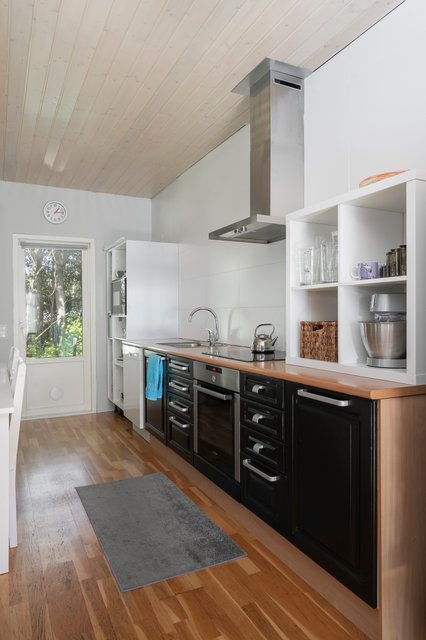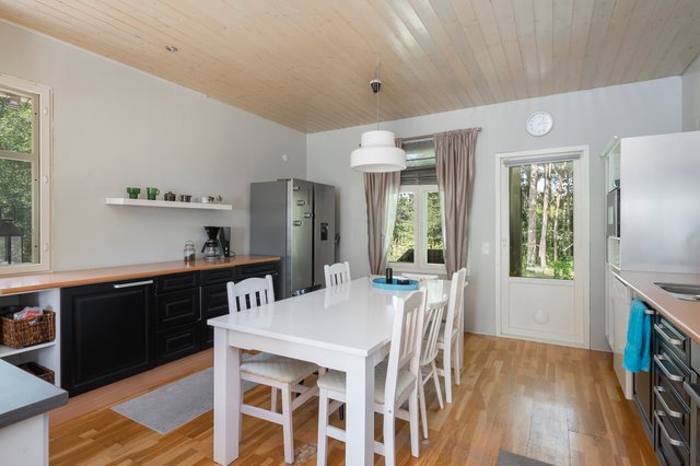 - Valoisa ja käytännöllinen keittiö, joka on suunniteltu tukemaan sujuvaa arkea. Runsaasti kaappi-ja laskutilaa. Keittiöstä on myös käynti suoraan ulos, mikä mahdollistaa helpon yhteyden terassille tai puutarhaan.
