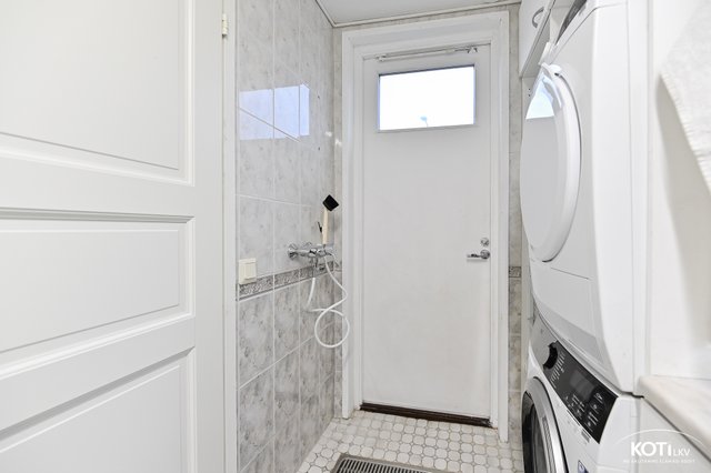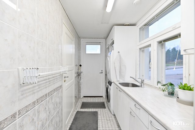 - Käytännöllinen kodinhoitohuone, jossa kaapistoja, työtaso, lavuaari, vesipiste, pesukoneliitin, kulku ulos.