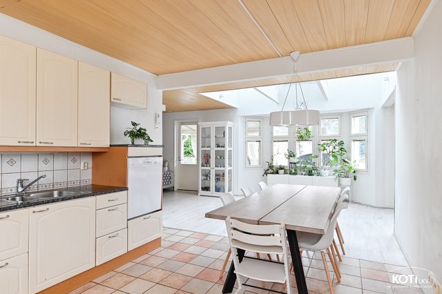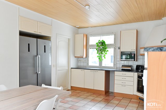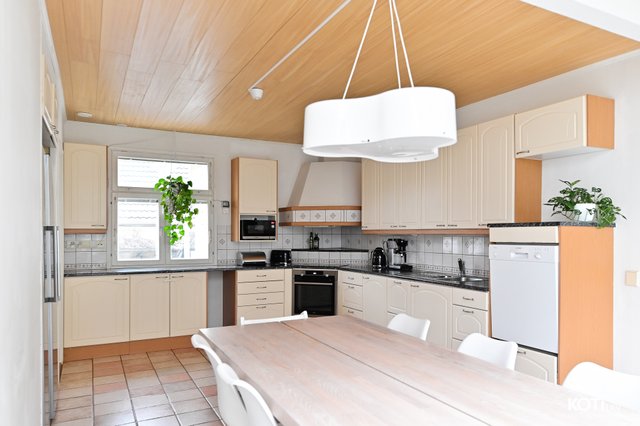 - Tilava, valoisa ja ajaton avokeittiö jossa paljon kaappi- sekä laskutilaa. Koneita on uusittu.