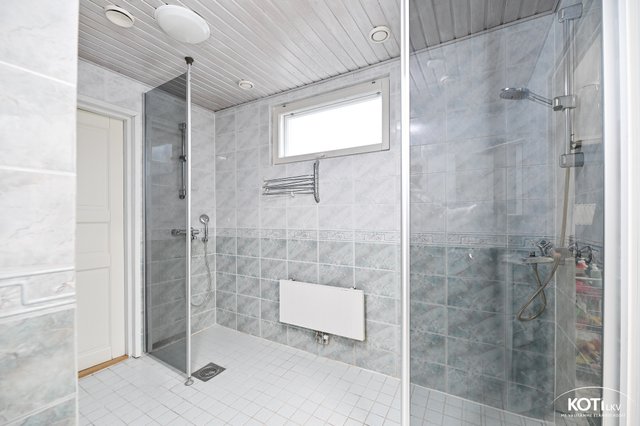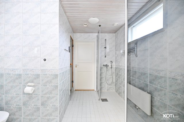 - Tilava kahden suihkun pesuhuone, pesuhuoneessa ikkuna, suihkuseinät, lavuaari ja wc.