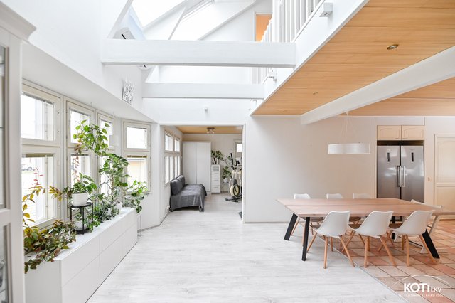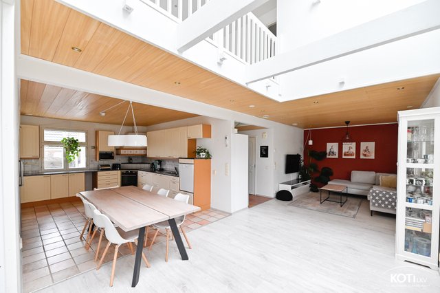 - Suuri ateljeeolohuone joka yhdistyy luontevasti, takkahuoneeseen, ruokailutilaan ja avokeittiöön. Olohuoneessa korkea huonetila, kulku osin katetulle terassille ja pihalle.