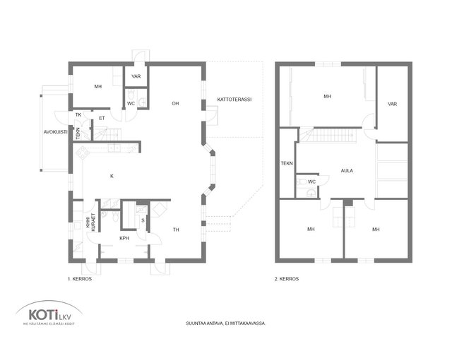 - Takkahuone, yläaula, eteinen, vaatehuone, varastoja, erillinen ulkorakennus jossa varasto ja verstas, autokatos, leikkimökki.