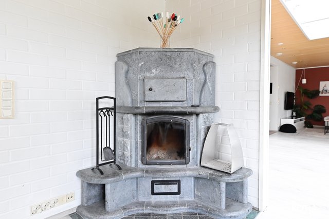 Kaukolämpö miellyttävällä lattialämmityksellä, koneellinen ilmanvaihto lämmöntalteenotolla, kaksi ilmalämpöpumppua viilentämään kesän helteellä, varaava takka + leivinuuni, autokatos.
