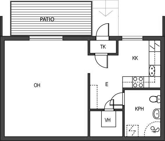 Asunnossa on laminaattilattiat ja maalatut seinät ja keittiö on varusteltu tarpeellisilla kodinkoneilla, ja kylpyhuoneessa on tilaa pesukoneelle. Säilytystilaa löytyy mukavasti kaapistojen ja vaatehuoneen muodossa. Asunnon edessä on pieni patio.