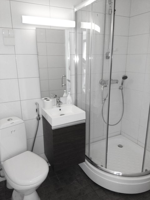 - WC-istuin, suihkukaappi, bidee-suihku, allaskaappi, peili, ja pesukoneliitäntä