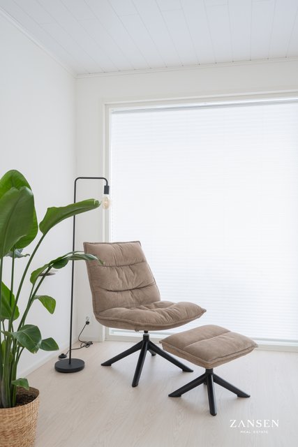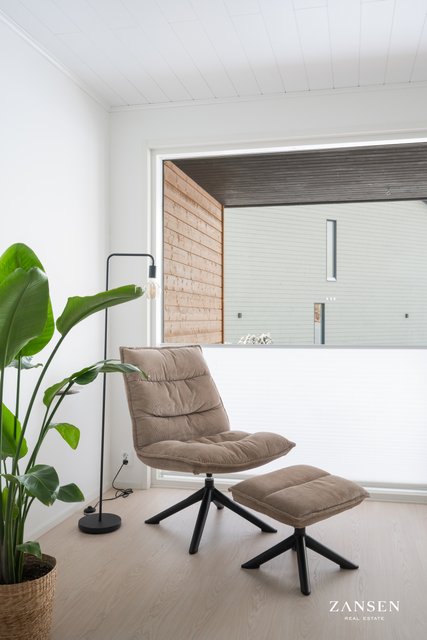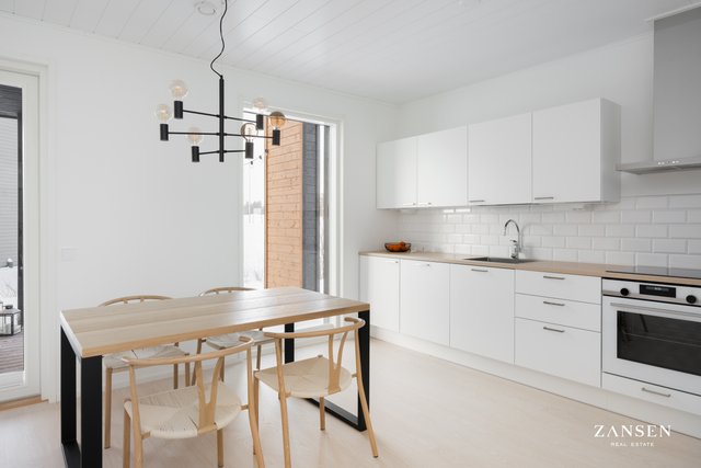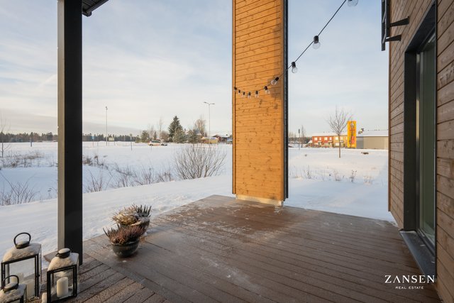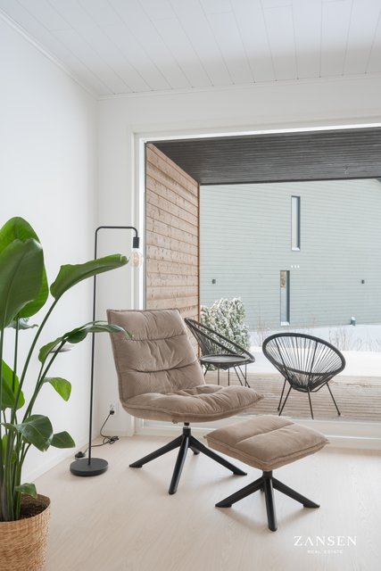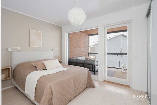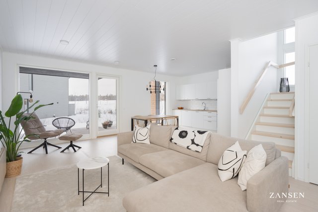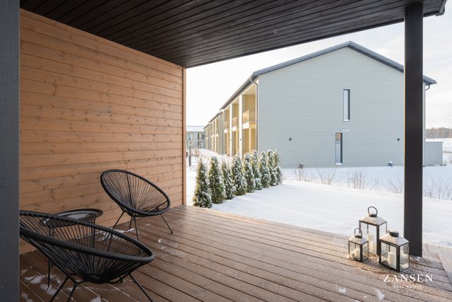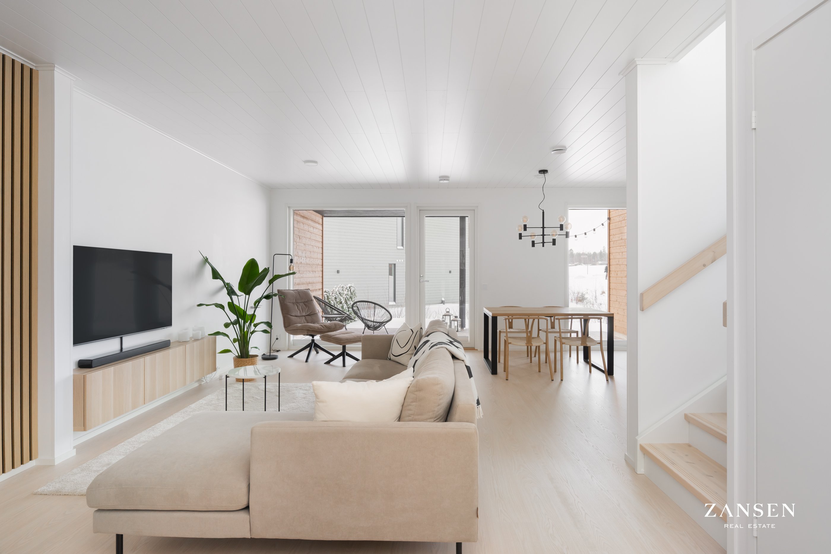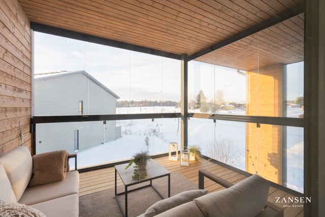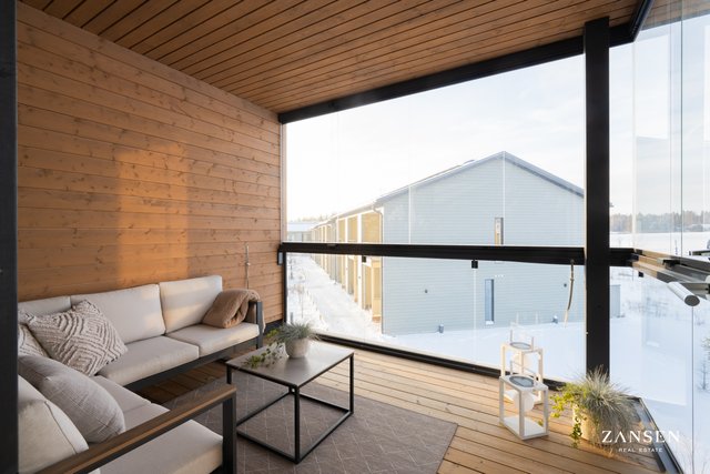 Avara olohuone ja avokeittiö luovat viihtyisän tilan ajanviettoon. Vesikiertoinen lattialämmitys mahdollistaa nämä upeat lattiasta lähtevät suuret ikkunat koko huoneistoon. Kylpyhuoneessa on käytännöllinen kodinhoitonurkkaus ja sauna tarjoaa rentouttavat löylyt. Kaksi erillistä wc:tä lisäävät arjen sujuvuutta. Asunnon länteen suuntautuva lasitettu parveke, suuri terassi sekä huoneiston ympäri kiertävä piha tarjoavat upeat mahdollisuudet nauttia ulkoilmasta.