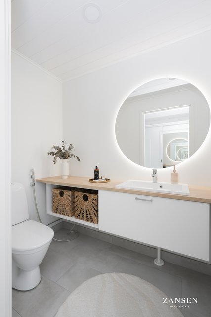 - Alakerran wc:ssä on allaskaapisto, valopeili ja wc-istuin. Yläkerran wc:ssä on allaskaapisto, valopeili ja wc-istuin.