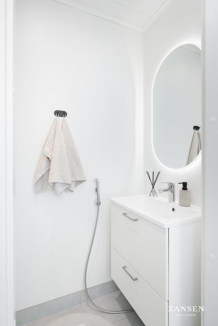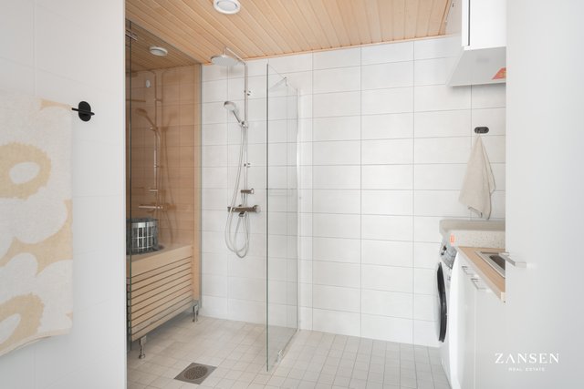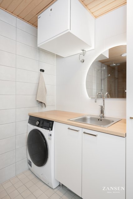 - Kylpyhuoneessa on kodinhoitonurkka, pesukoneliitäntä, sadesuihku, suihkuseinä ja valopeili. Lattialämmitys on vesikiertoinen.