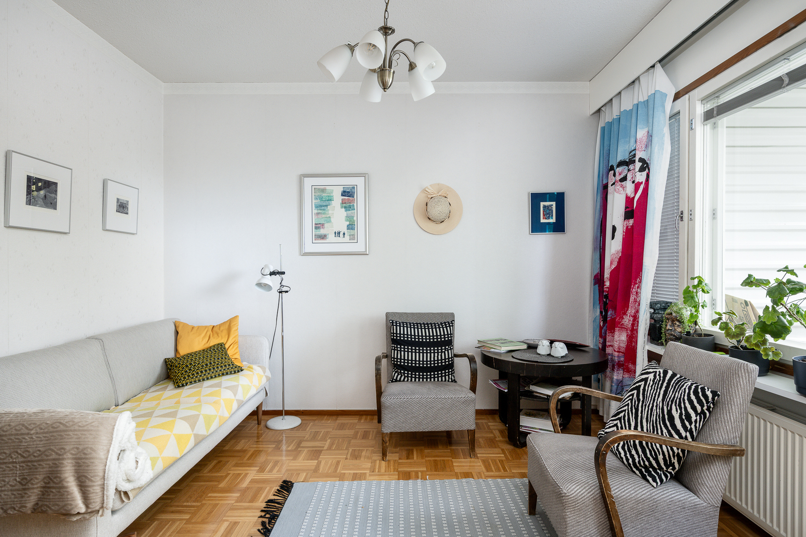 Tämä valoisa ja hyväpohjainen kaksio on kävelyetäisyydellä keskustasta, Mölymäen liikunta-alueelta ja ruokakaupoista. Olohuone ja keittiö muodostavat yhtenäisen ja viihtyisän tilan. Säilytystilaa löytyy vaatehuoneen ansiosta ja lasitetulta parvekkeelta voit nauttia vehreistä näkymistä. Asunnossa on kaunis alkuperäinen mosaiikkiparketti, siistit pinnat ja oma sauna. Taloyhtiö on rakennettu vuonna 1990.