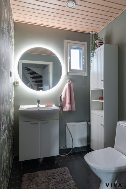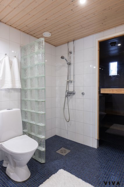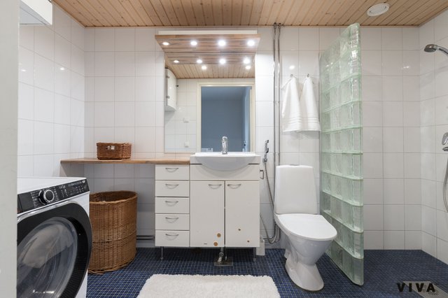 - WC-istuin, suihku, suihkuseinä, pesukoneliitäntä, lattialämmitys, peili, allaskaappi, ja bidee-suihku