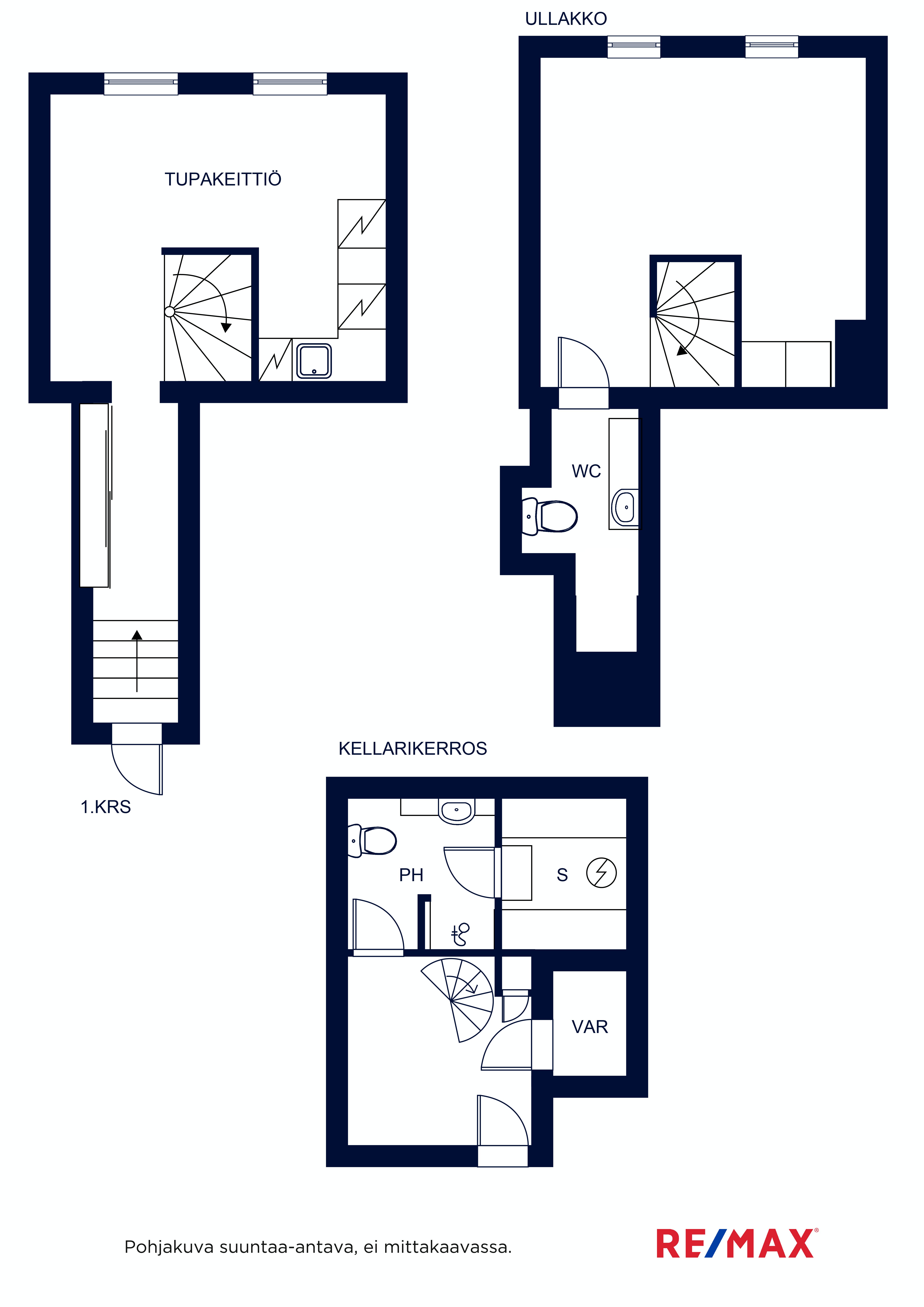 - Huoneisto on virallisesti keskikerroksen mukaan 24 m². Muut tilat= kellarikerros sekä ullakko, joiden pinta-alatiedot ovat rakennuspiirustuksista. Pinta-alat eivät ole virallista asuinpinta-alaa. Kellarin ja ullakon käyttötarkoitukset, huonekorkeudet ja ikkunapinta-alat eivät välttämättä täytä asuinpinta-alaksi laskettavan tilan vaatimuksia. Ei tarkistusmitattu. Pinta-alat saattavat tämän ikäisissä kohteissa (yhtiö rekisteröity ennen 01.01.1992) poiketa olennaisestikin asuinrakennusten nykyisten mittaustapojen ja standardien (SFS 5139) mukaan laskettavasta asuintilojen pinta-alasta. Pinta-ala voi siis olla edellä mainittua pienempi tai suurempi.