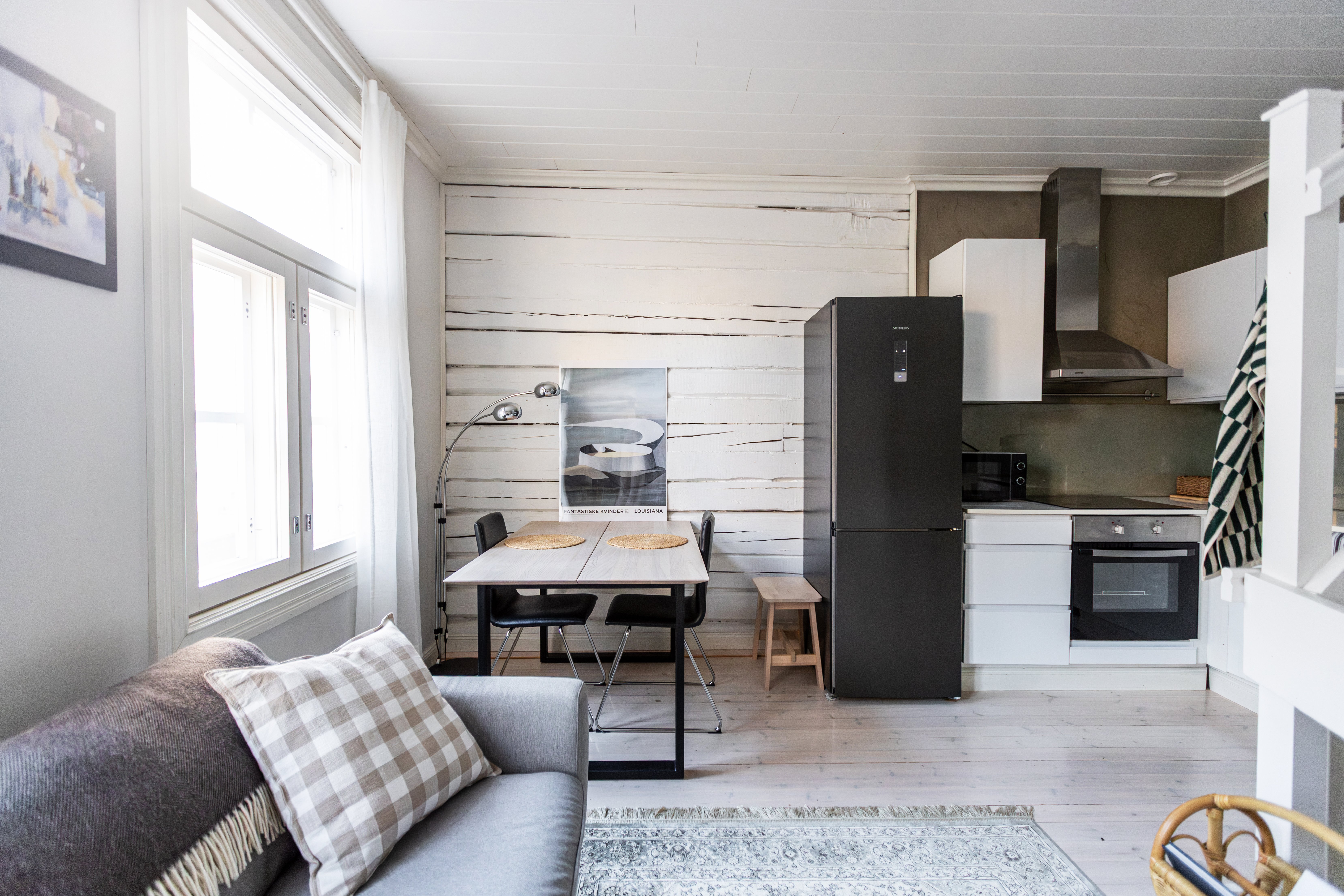 Keskikerroksessa oleva keittiö on varusteltu nykyaikaisin laittein hirsiseinän tuodessa tyylikkyyttä. Kellaritilassa on erittäin tilavat pesuhuone ja sauna, jotka on remontoitu noin 10v sitten. Kellarin huonetila on viihtyisä, jossa rouheutta tuo yksityiskohdat kivestä ja hirrestä, tilassa on myös kaiuttimet hyvään musiikkikokemukseen. Ullakolla on makuutilat sekä wc. Tämän muuttovalmiin kodin tyyli on yhtenäinen kauttaaltaan. Huoneistolla on käytössä viihtyisä erillinen terassialue.