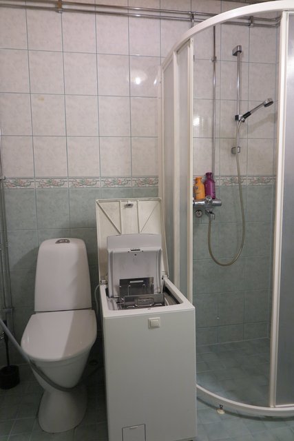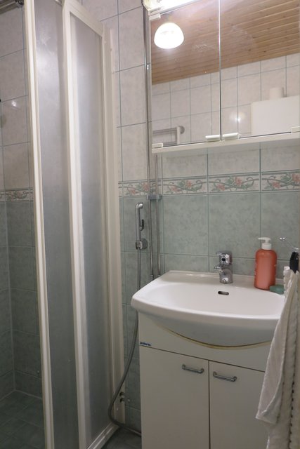 - Suihku, wc-istuin, peilikaappi, bidee-suihku, allaskaappi, ja pesukoneliitäntä